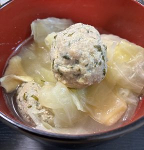 今日のお昼は、鶏団子汁 です❣️ しょうがも入って 体が温まる〜❤️ ポカポカになりました。😊😊