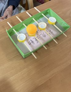ペットボトルの蓋に ピン球を乗せて、隣りの蓋に移動させます。簡単👍と 思いましたが、意外に難しかったです。。。😢